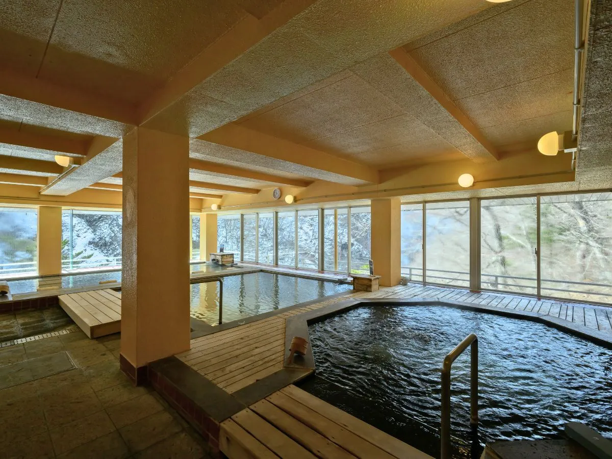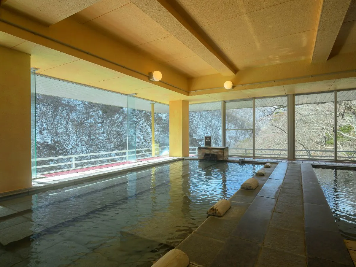 お風呂 ■展望大浴場〈寝湯、全身湯、泡風呂、オンドル式低温サウナ〉 6階に女性、7階に男性用があり、大きさは全く同じで、眺望が抜群。 全面ガラス張りの開放感と源泉掛け流しの天然温泉を、一日中お楽しみいただけます。 日中は、10:00〜15:00が清掃時間となります。 ■渓谷風呂〈檜風呂男女別〉 ご宿泊者様だけにご利用いただける露天風呂でございます。 目の前の景色と耳を澄ませば聞こえる鳥のさえずり。昼も夜も素敵な時間をお過ごしください。 夜19:30より、有料貸切風呂となります。 ■野天風呂営業再開〈混浴風呂のみ〉 【重要】2020年4月中旬に発生した落石による施設損壊のため、野天風呂の利用を休止しておりましたが、2022年11月26日に一部営業再開致しました。女性専用美人の湯の営業再開は未定です。