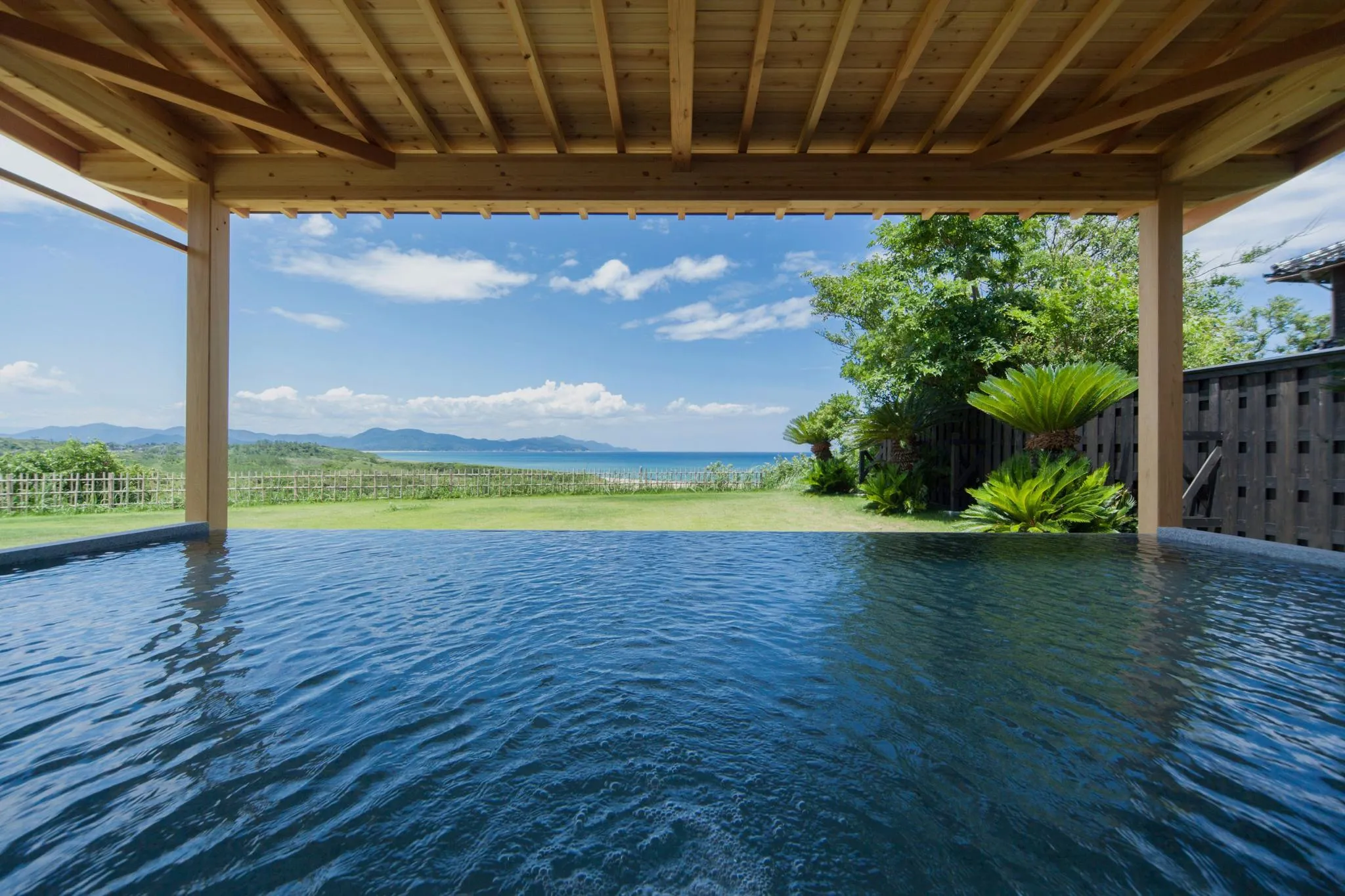 お風呂 天然温泉の大浴場がございます。 ※二つの大浴場(露天風呂付)は、男女入替制となります ◆大浴場・客室露天風呂(夕日ヶ浦温泉)◆ 当館のお湯は、美肌効果が高く「美人の湯」として知られる夕日ヶ浦の源泉を引いております。 海景の客室には、この名湯を心ゆくまで堪能できる専用の露天風呂を完備いたしました。24時間、潮風を感じながらプライベートな空間で気兼ねなく温泉をお楽しみいただけます。 また、大浴場では海と空、そして湯面が一体となったような圧倒的な開放感を味わえます。男女入れ替え制にて、力強い石組みと木々が調和した庭園露天風呂もご利用いただけます。時間とともに移り変わる景色を眺めながら、心休まるひとときをお過ごしください。
