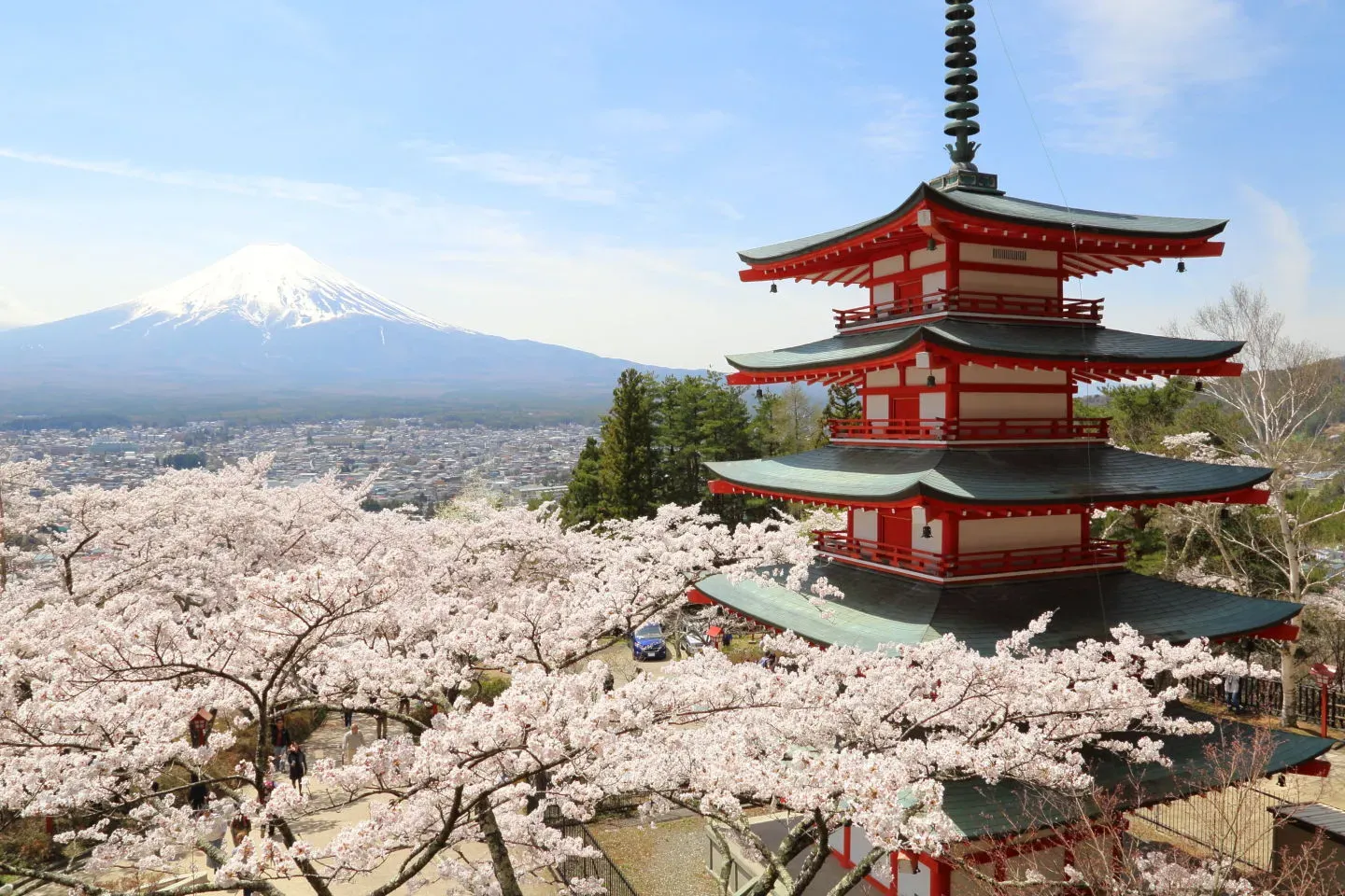 「新倉山浅間公園(あらくらやませんげんこうえん)」は、富士山と五重塔、そして春には満開の桜という日本らしい風景が一枚に収まる大人気の撮影スポット。特に「忠霊塔」と呼ばれる五重塔と富士山を一望できる展望台は、国内外から多くの観光客が訪れる絶景ポイントとして有名です。