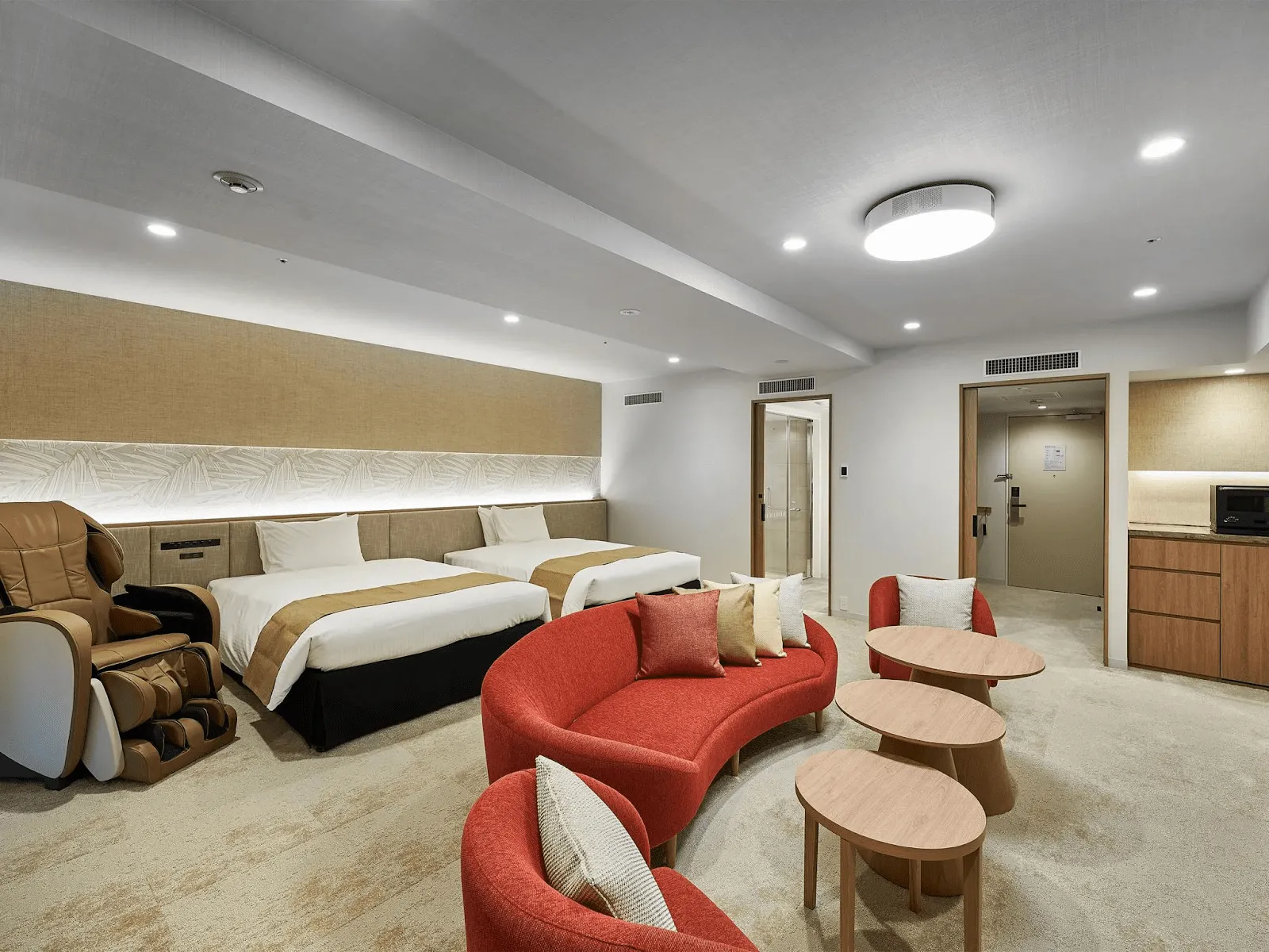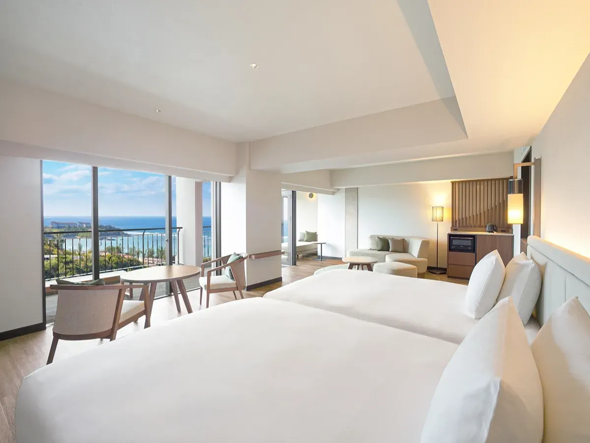 客室はスイートタイプが中心で、全室にキッチン・洗濯機・電子レンジを完備。広々としたリビングダイニングエリアがあり、自宅のようにくつろげる空間が魅力です。特に家族旅行やグループ旅行に最適で、プライベートな時間を大切にしながら滞在できます。宜野湾市は、那覇市と恩納村のちょうど中間地点にあり、観光の拠点として便利なのも魅力。