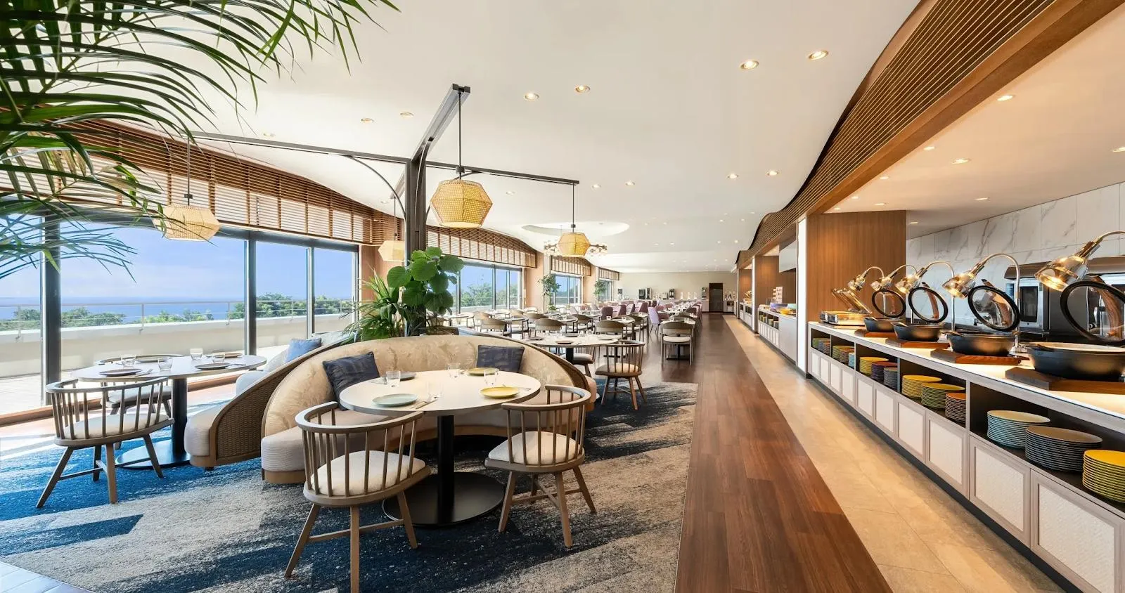 レストラン「ル・サンソリアル」では、海を眺めながら楽しむビュッフェが人気で、季節の食材を使った彩り豊かな料理が魅力です。温泉露天風呂では潮風に包まれながらくつろげるひとときが過ごせます。SUPや釣りなどのアクティビティも充実しており、海と自然を満喫したい方にぴったりの滞在先です。