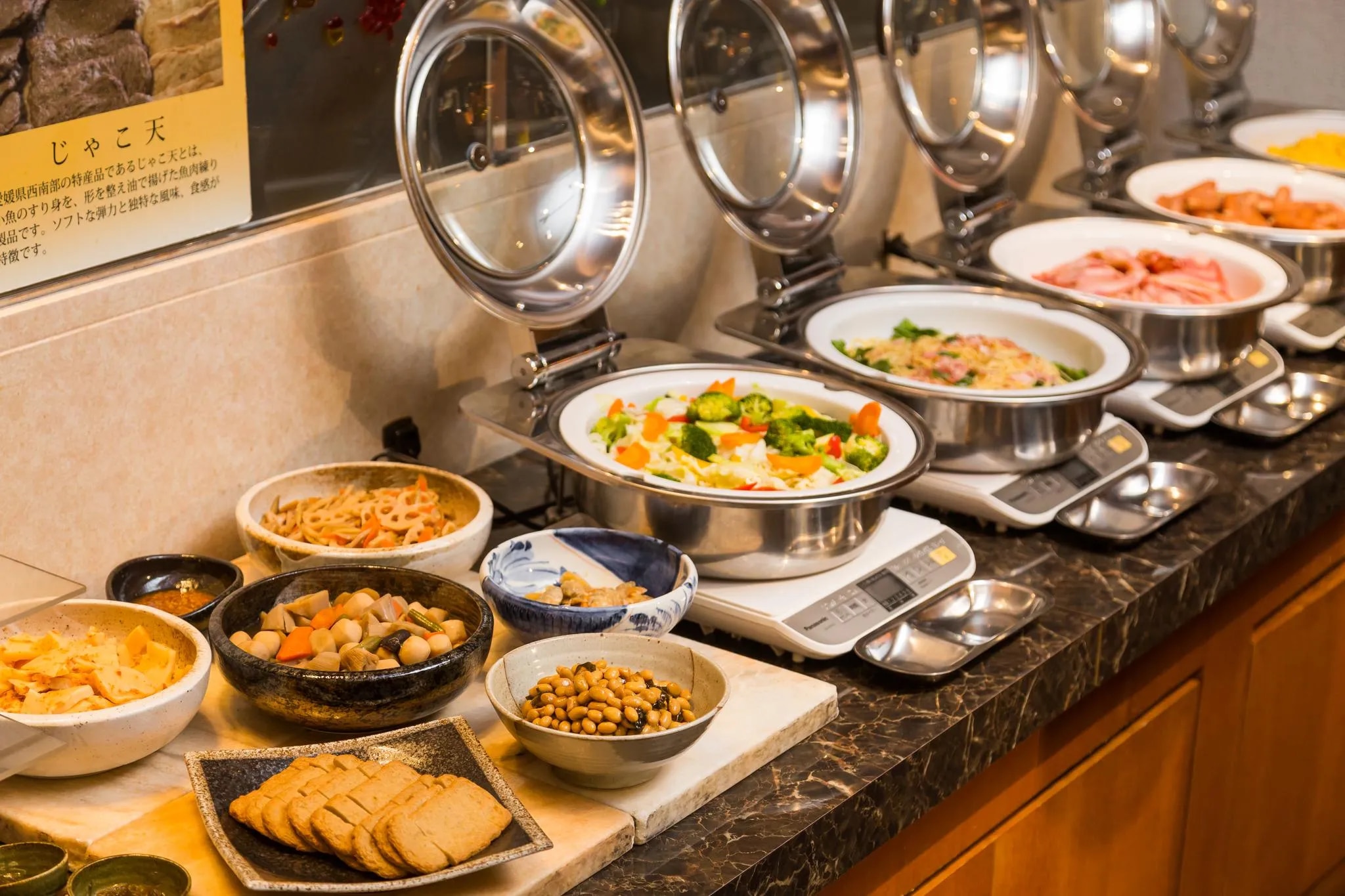 レストラン 1日のはじまりは、ホテルでしっかりご朝食を。 朝食はブッフェ形式となっております。愛媛の食材を使ったコーナーや焼き立てのパンを準備しております。是非、ご賞味ください。 【営業時間】6:30~10:30 【料金】大人:2.200円小学生、1000円 幼児、無料