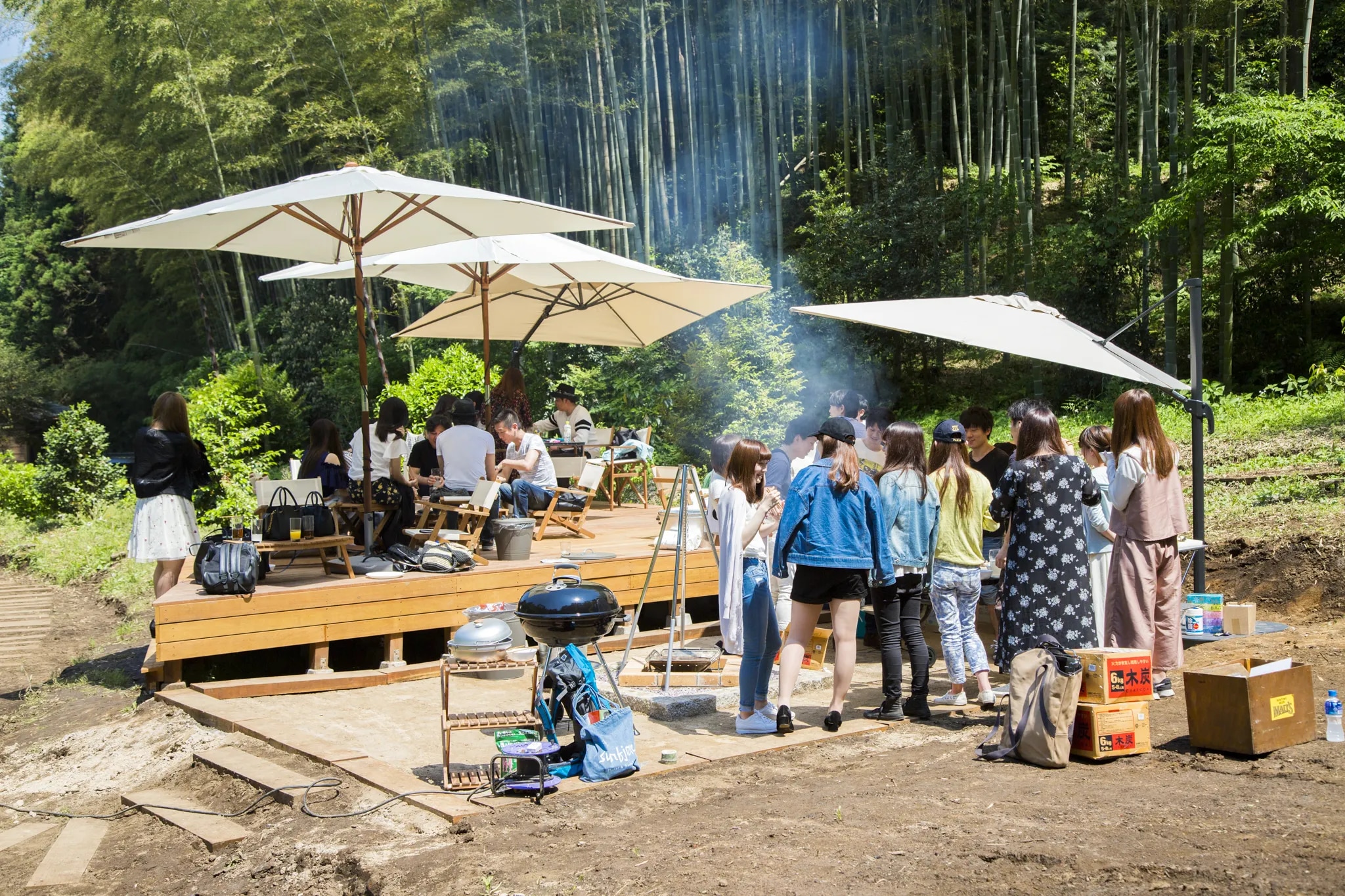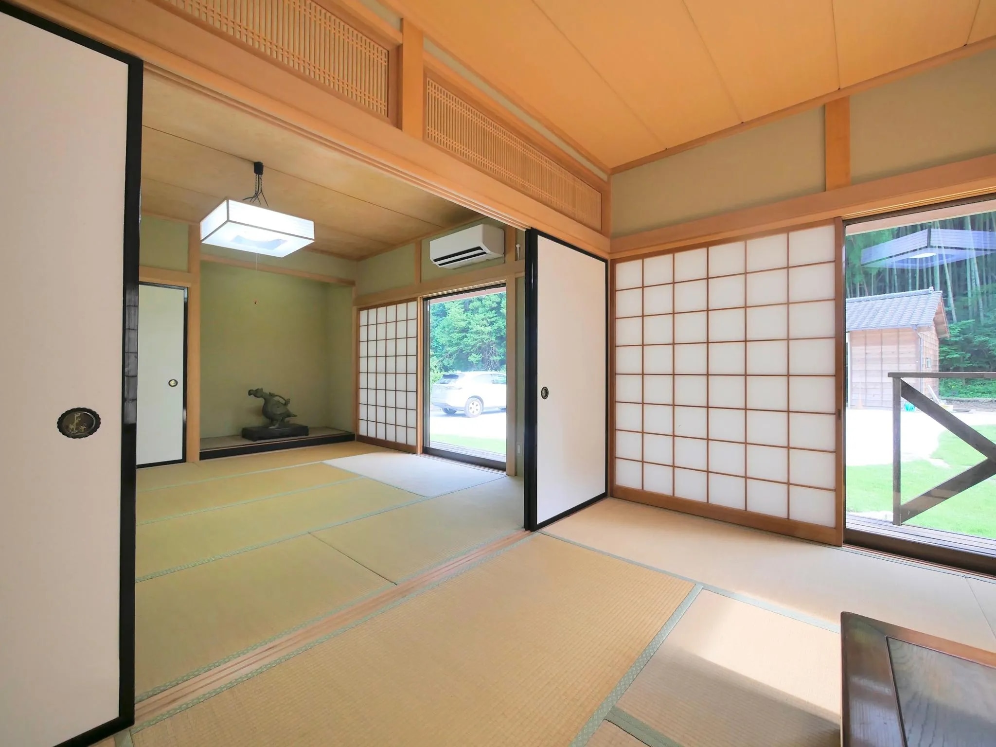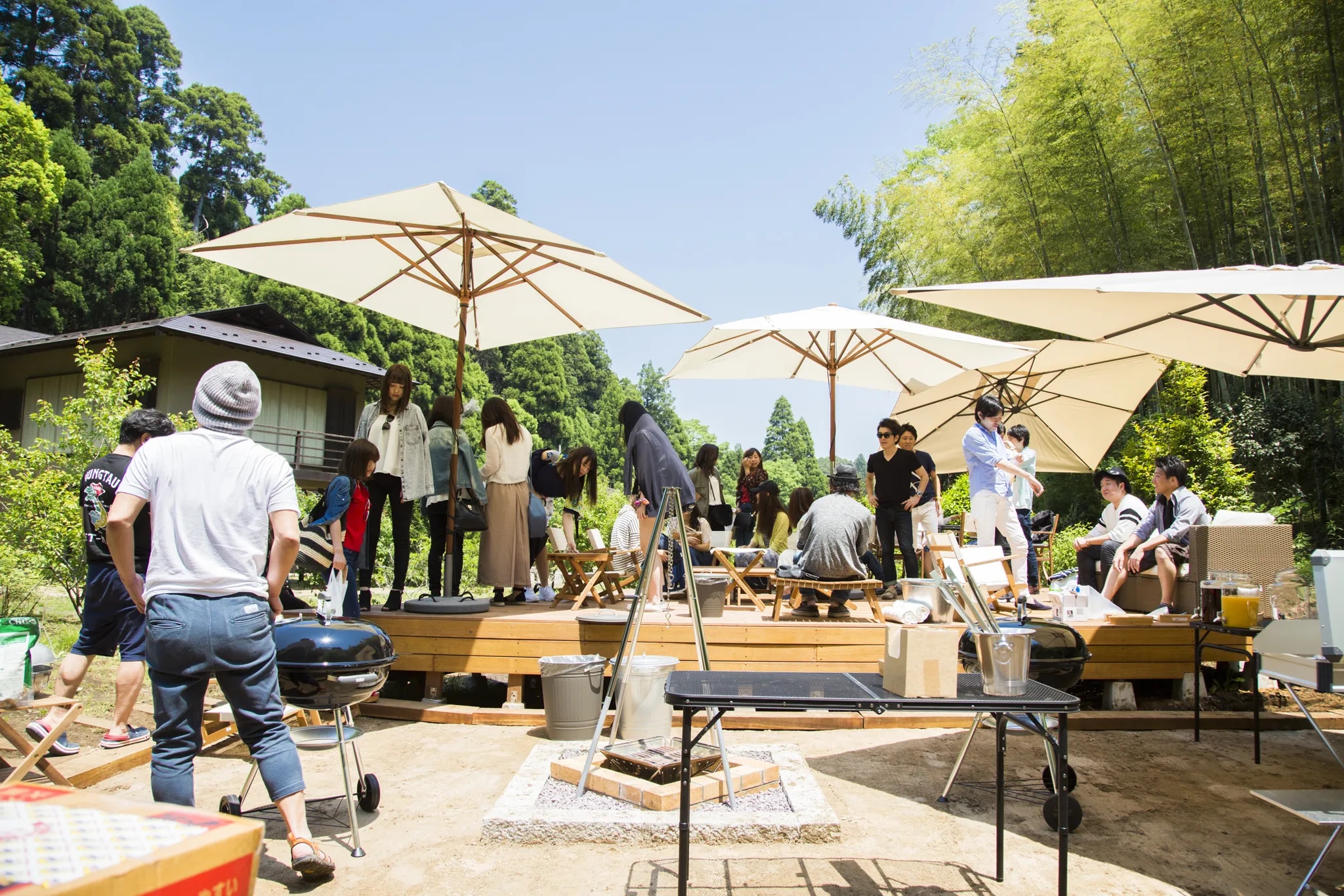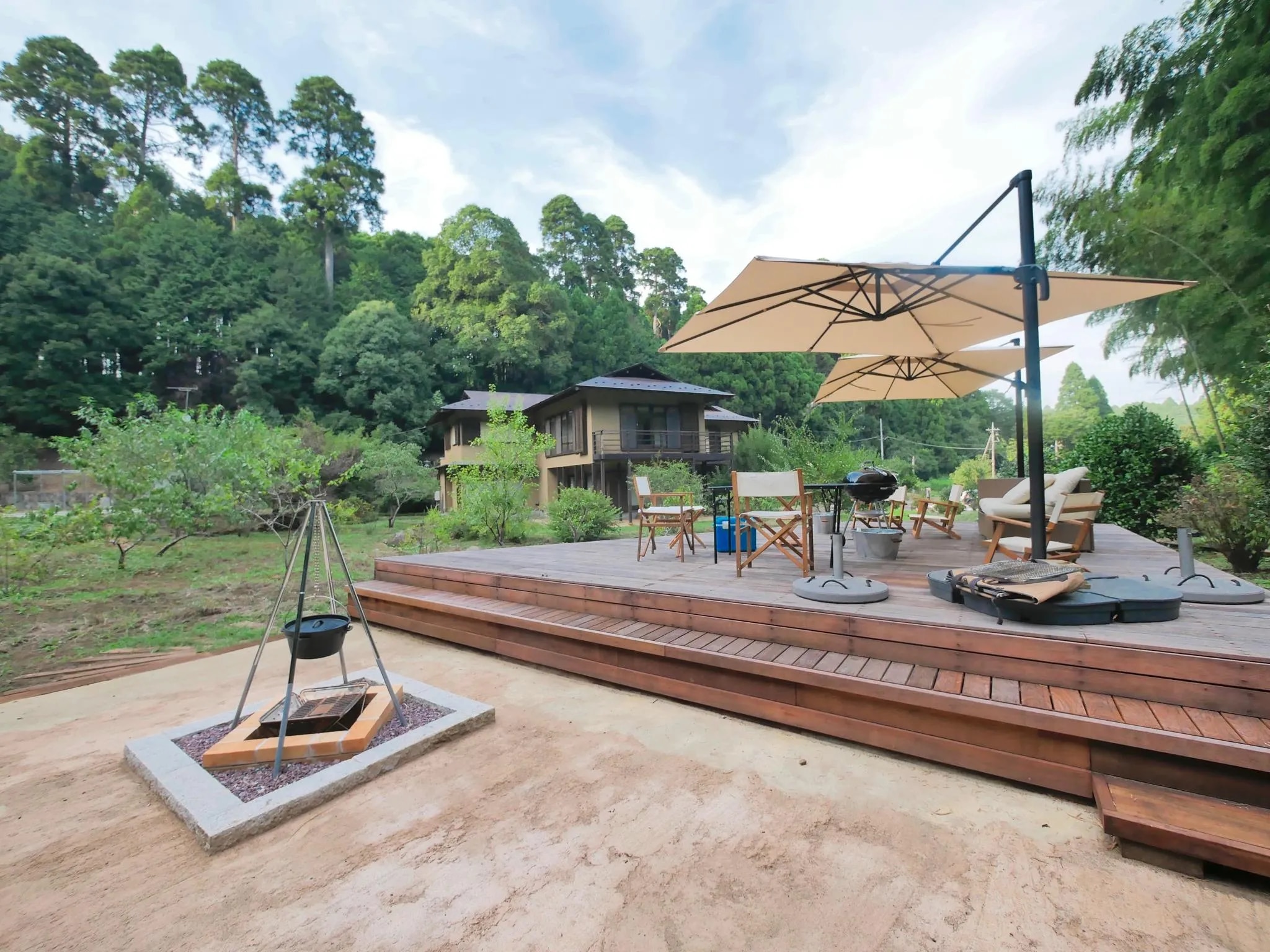 都心から1時間半、 周囲を緑に囲まれた2,000坪のプライベート空間です。 敷地内には岩風呂や茶室を併設した 20畳の和室がある母屋と、宿泊もできる平屋、 庭にはBBQウッドテラスやプライベートプール、 枯山水の庭園が広がります。 BBQテラスでは、昼のBBQはもちろん、 夜はキャンプファイヤーや、満点の星空を楽しむことも可能です。 エントランスには、6台分の駐車スペースもあります。 ご友人やご家族でのご宿泊に、またグループ研修、合宿等、 様々な用途でのご利用をお待ちしています。