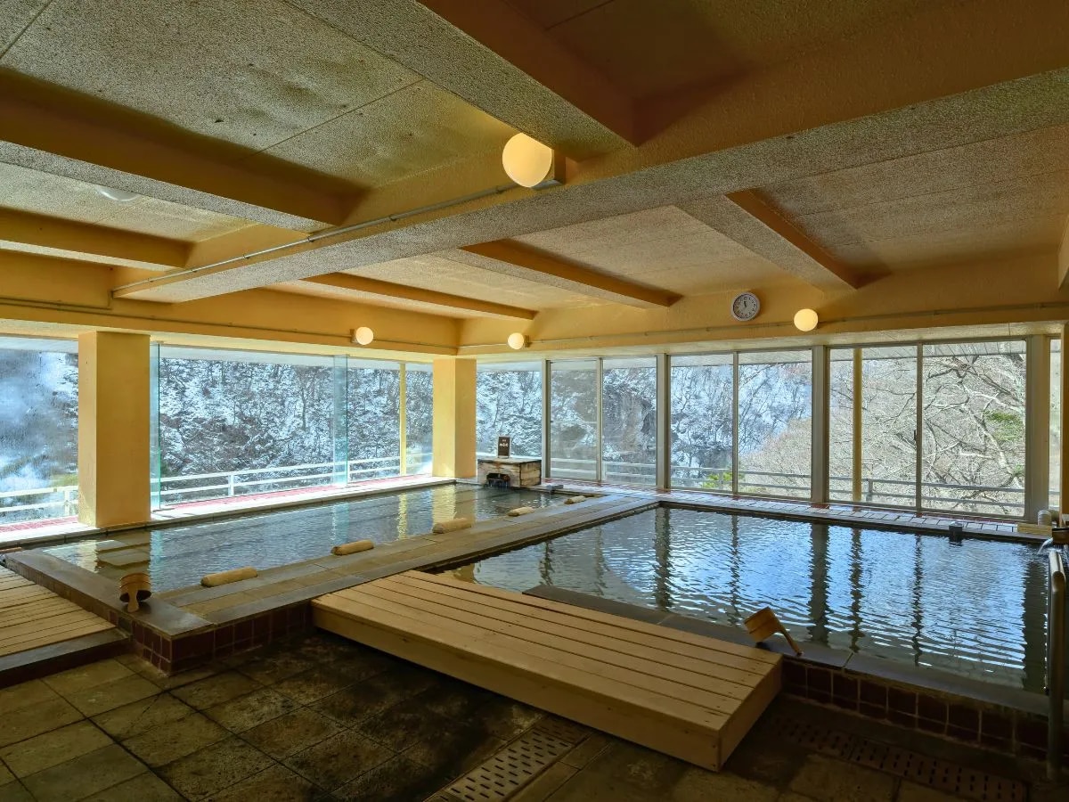 お風呂 ■展望大浴場〈寝湯、全身湯、泡風呂、オンドル式低温サウナ〉 6階に女性、7階に男性用があり、大きさは全く同じで、眺望が抜群。 全面ガラス張りの開放感と源泉掛け流しの天然温泉を、一日中お楽しみいただけます。 日中は、10:00〜15:00が清掃時間となります。 ■渓谷風呂〈檜風呂男女別〉 ご宿泊者様だけにご利用いただける露天風呂でございます。 目の前の景色と耳を澄ませば聞こえる鳥のさえずり。昼も夜も素敵な時間をお過ごしください。 夜19:30より、有料貸切風呂となります。 ■野天風呂営業再開〈混浴風呂のみ〉 【重要】2020年4月中旬に発生した落石による施設損壊のため、野天風呂の利用を休止しておりましたが、2022年11月26日に一部営業再開致しました。女性専用美人の湯の営業再開は未定です。