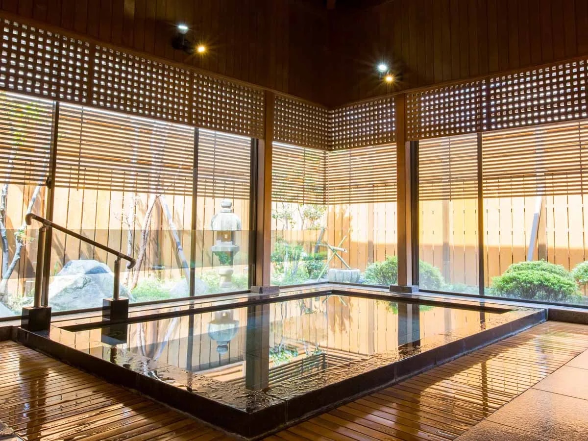 お風呂 石組みの湯船に浸かり天を仰げば、まるで天に向かう木組みの傘のように 感じさせる木組み傘天井。 よりリラックスしていただくため、大浴場ではBGMを流しています。 湯上りには「富士山の湧水」をご用意しております。 ※大浴場は2か所ありますが、庭園露天風呂は1か所のため 19時半より男女入れ替えとなります。 【入浴可能時間】15時~23時/6時半~9時 (19時より30分間は清掃のため、ご利用できません)
