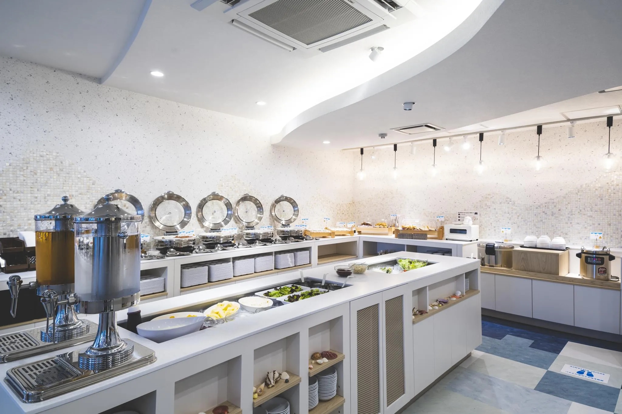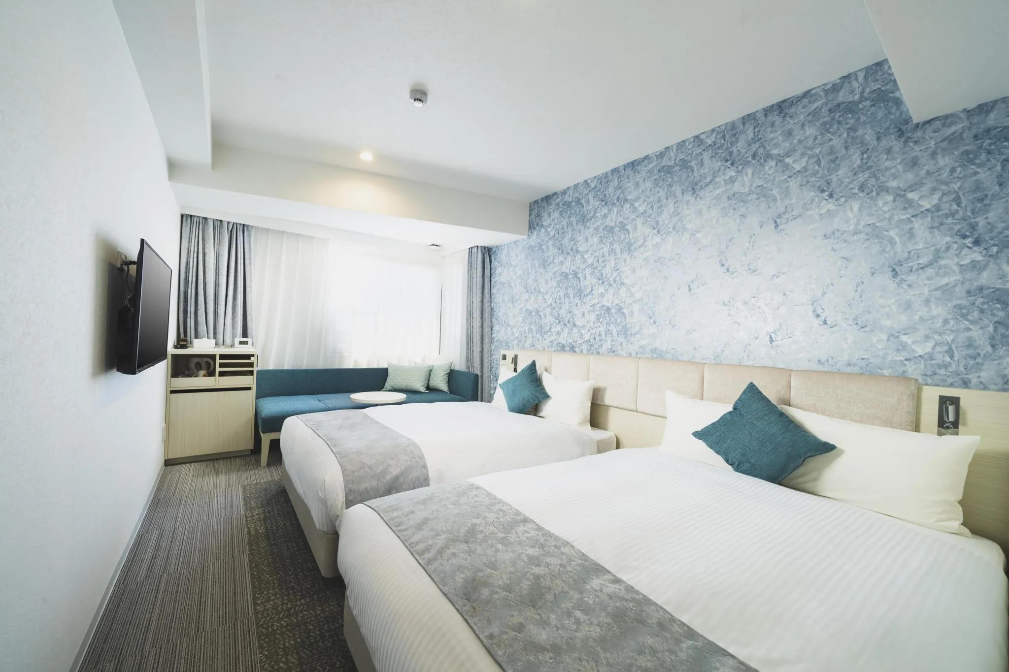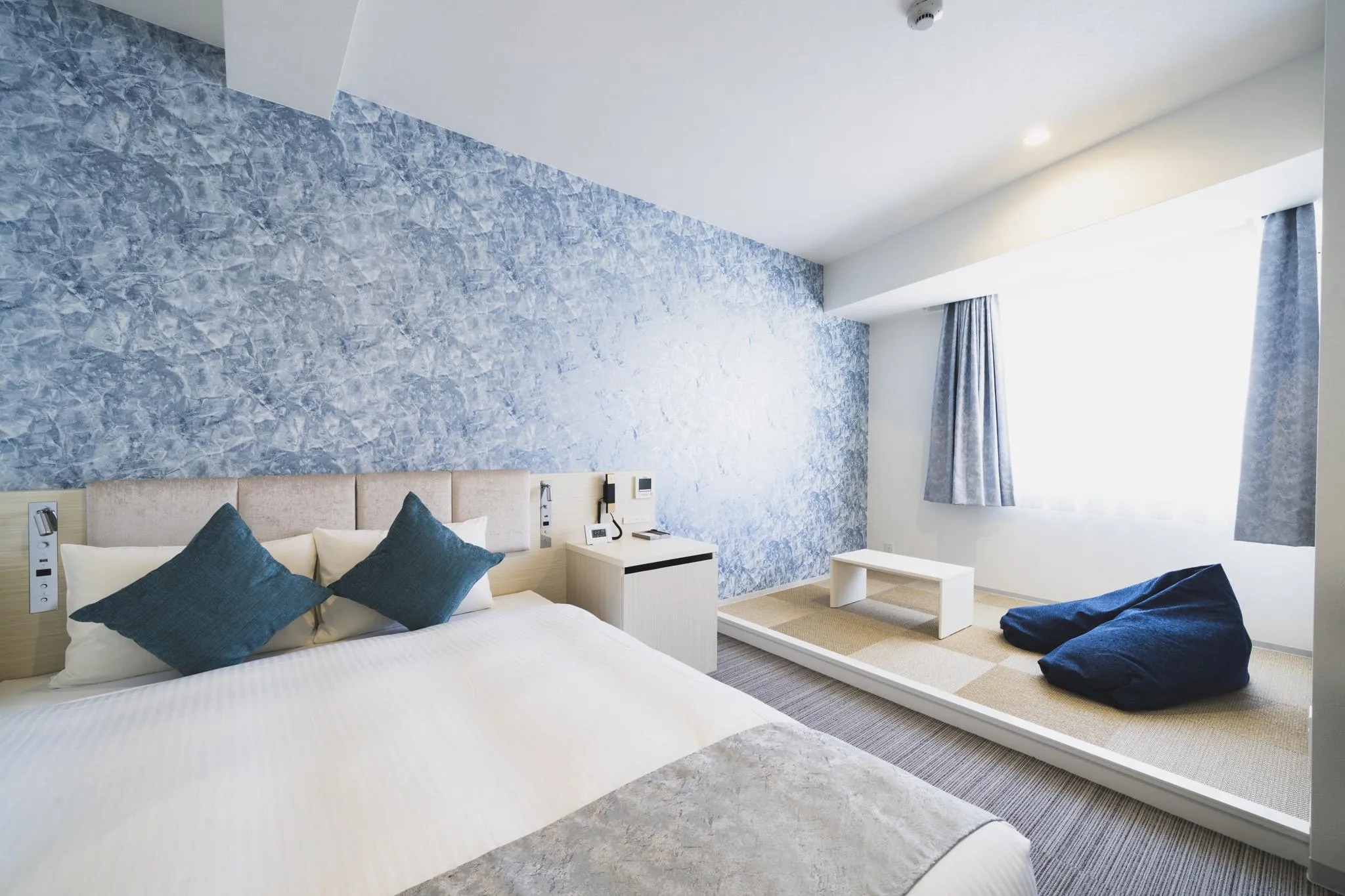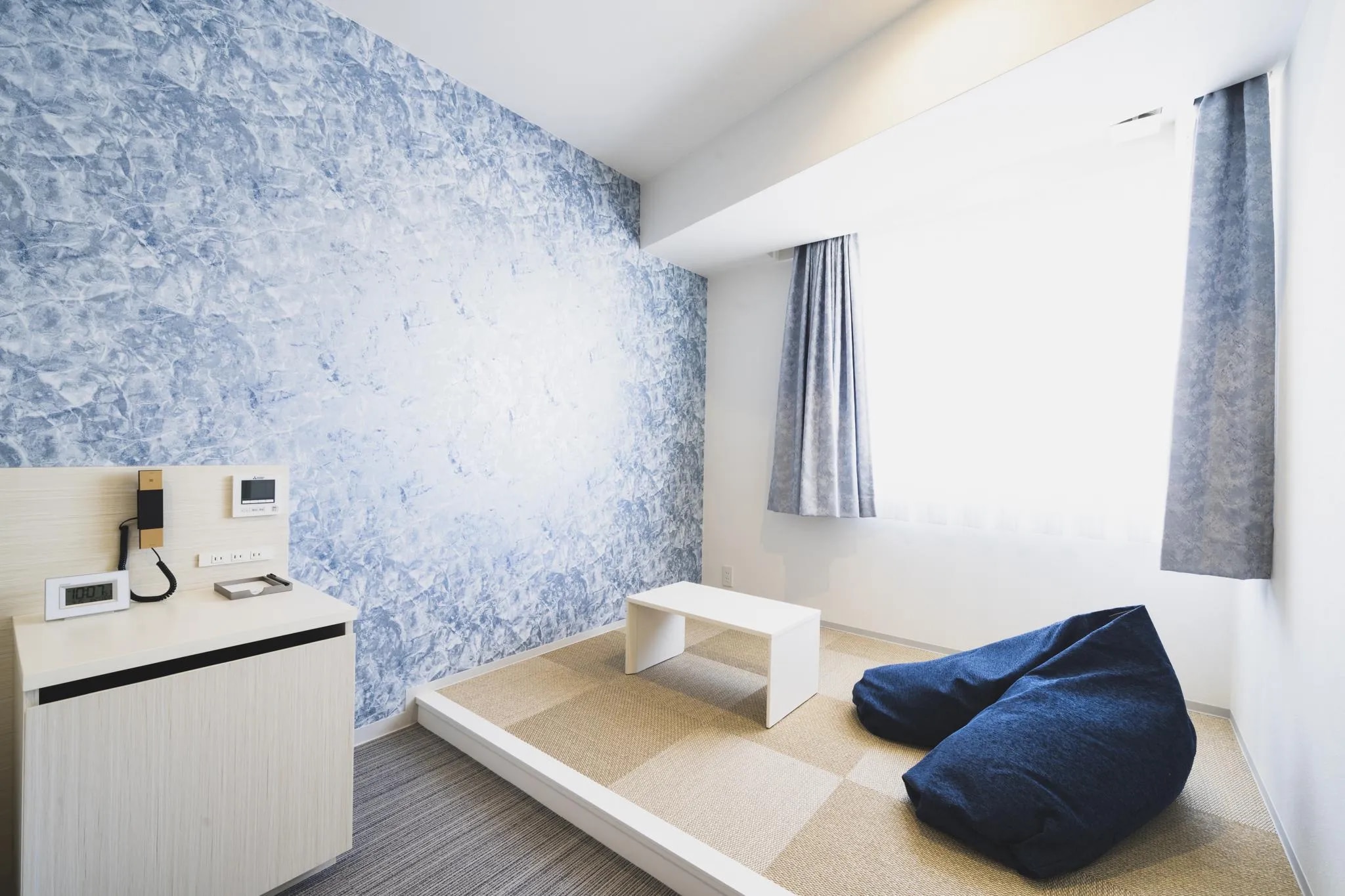 46都道府県とは異なる独特の時間感覚が存在する沖縄県(ウチナータイム) 県内外の観光客に時間を忘れて滞在していただける空間とサービスを提供し、 リゾート地ならではのおもてなしを体現。 沖縄は旧暦と新暦が時を刻んでおり、 ジブンたちだけの特別なトキが刻める施設。 デザインコンセプトは、白い砂浜 フロントは、白を基調としており、大きな窓から入る太陽の光、 展示している琉球ガラスは鮮やかな色彩で、 白い砂浜と砂浜に輝く鮮やかな貝殻を表現しており、 沖縄の海を訪れたかのような空間演出をしています。 客室は沖縄の白い砂浜と青い海をイメージしたデザイン。 シンプルで落ち着いた空間で滞在中も心地よくお過ごしいただけます。