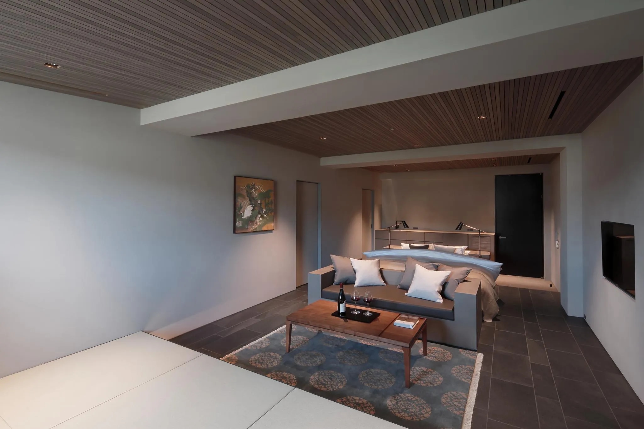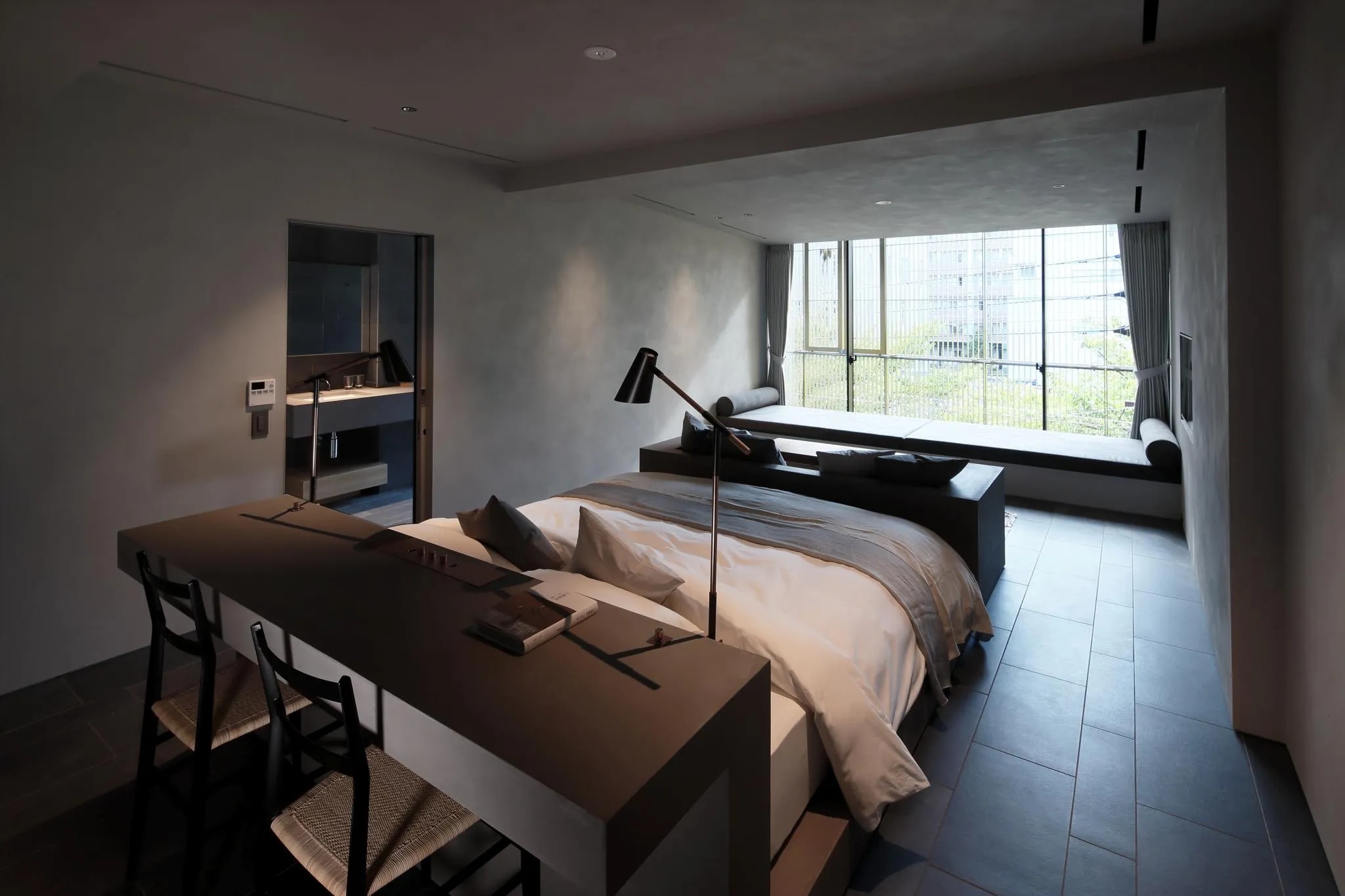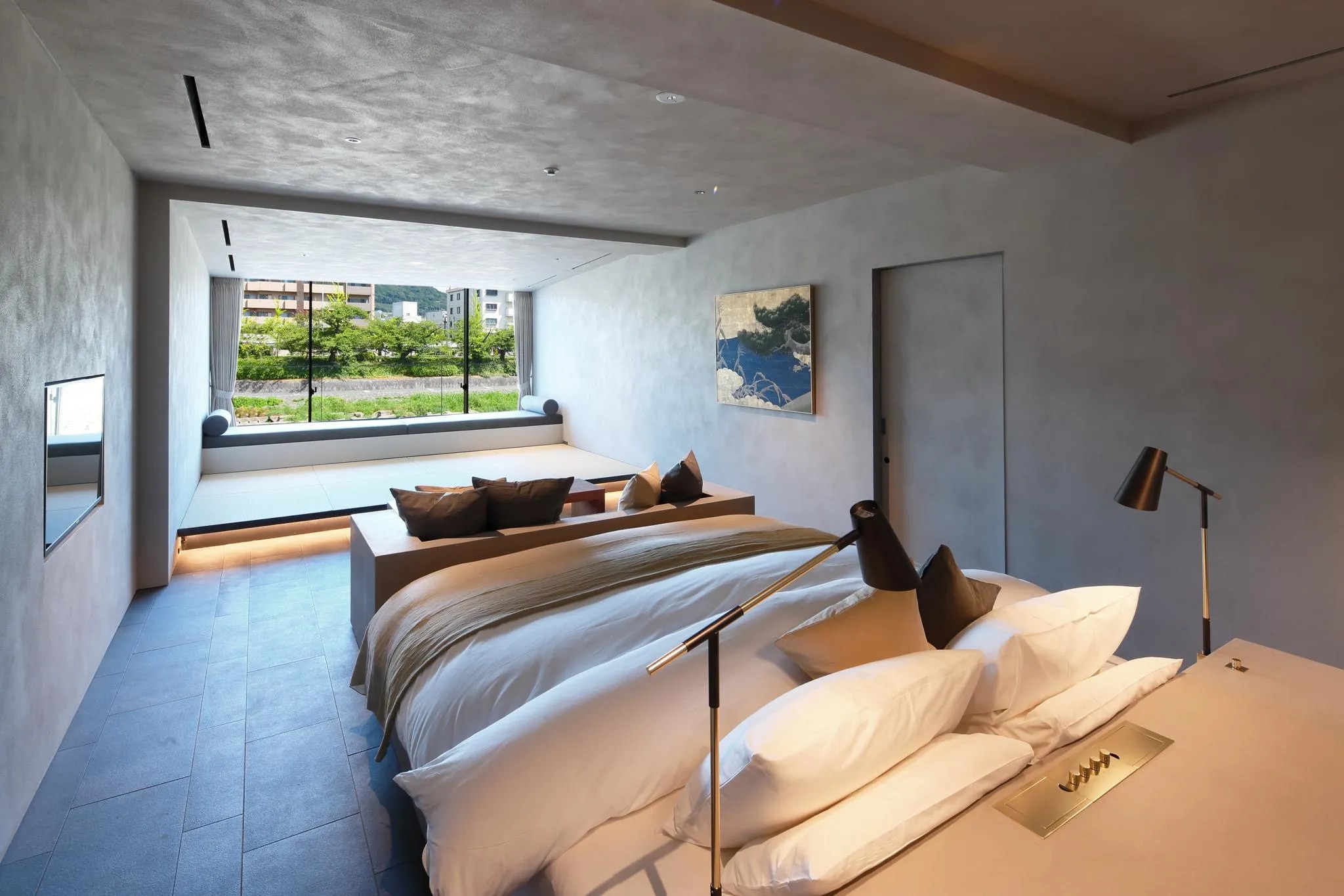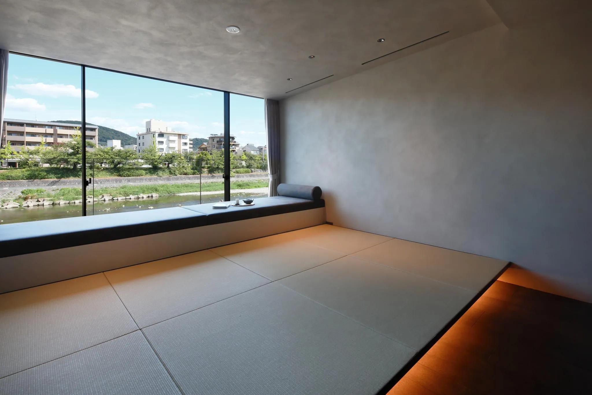 このホテルの優位性は、交通便利な好立地と窓から見える鴨川の景色、広々とした部屋にあります。 移動に理想的な場所にあり、京都の景観と散策を楽しみながら、駅から徒歩でお越しいただける点も優位な立地の魅力となっております。 本物件は、鴨川に面して建てられており、鴨川ビュールーム(鴨川沿い)には天井から床まで一面のガラスになっており、素敵な鴨川ビューを満喫できます。 全5室ある中、4室は鴨川ビューが眺められる「鴨川沿い」となっております。 春には鴨川沿いに咲き乱れる桜が、秋には鴨川沿いの紅葉が、冬にはうっすらと雪景色になった東山の山々や比叡山を望むことができます。 高層階のお部屋からは大文字の送り火も鑑賞することができます。さらに鴨川沿いの建物では珍しく、屋上があります。この屋上も宿泊者さまはご利用可能となっており、屋上から鴨川を隔てて見える風景は、東山魁夷作「年暮る」の風景と重なり合うものがあります。屋上からは、五山の送り火(大文字)を望むことができます。