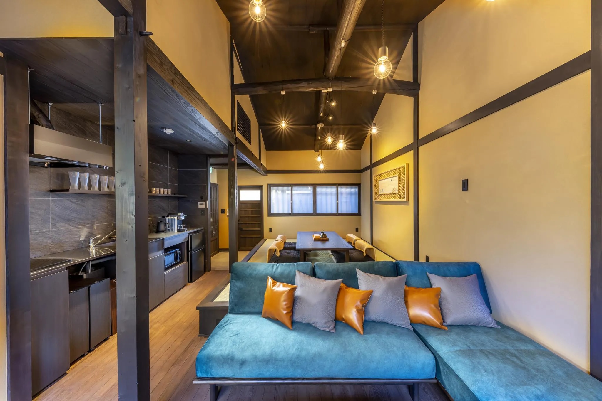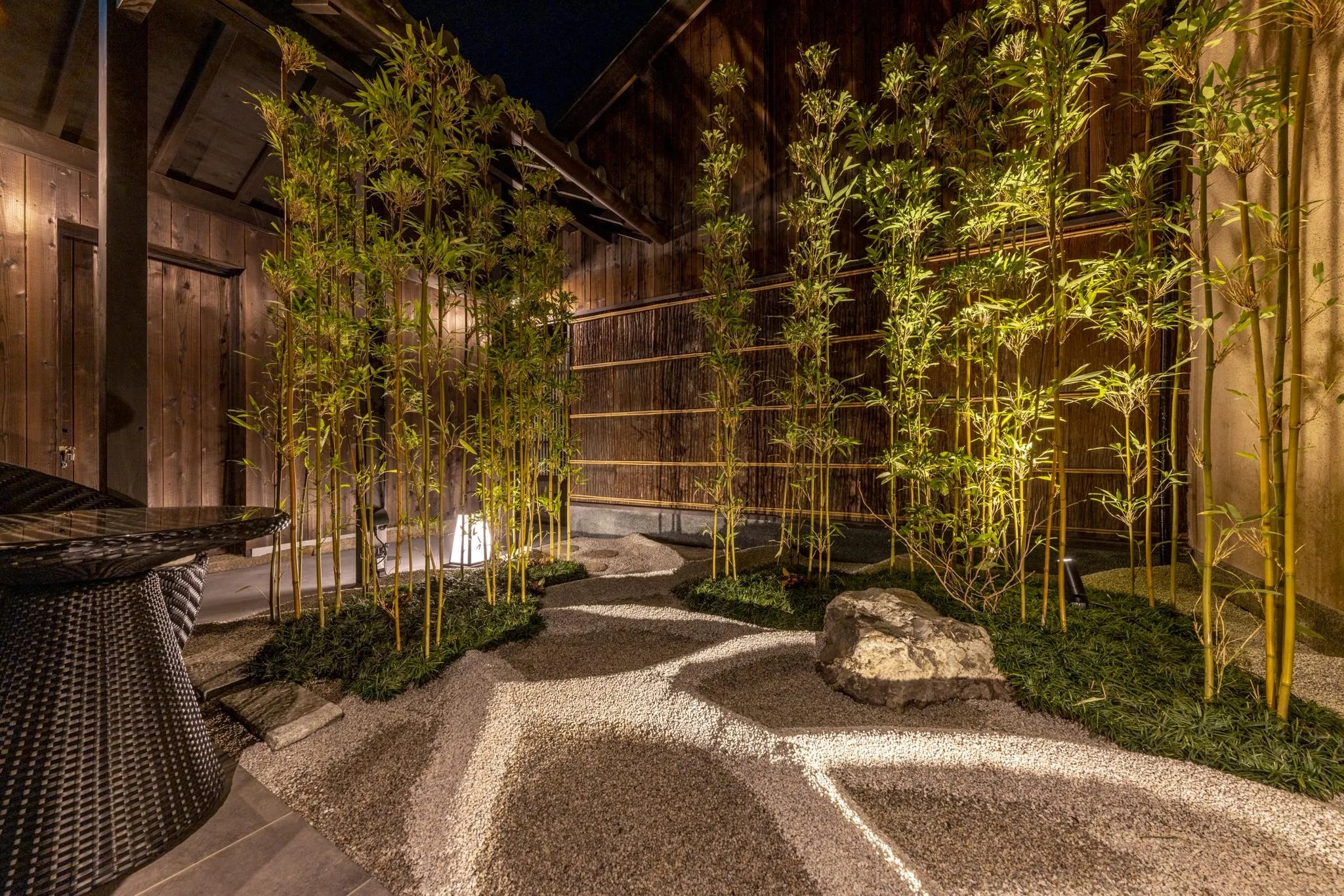 祇園の中心を流れる白川を近くに、路地奥に広がる京町家の大人の隠れ宿。 趣が異なる2つの庭園を臨む平屋のラウンジ棟と、 癒しの香り漂う檜風呂の湯処、寝室・和室からなる客室棟。 それらすべてが貸し切りの贅沢さ。 2棟をサンダルで行き来する様は、まるで小さな旅館を貸し切ってるようで気分も高まります。 小上がりの和室と庭を臨む大きなソファ、ミニキッチンがあるラウンジ棟には 自由に飲食していただける京都の地酒なども揃っています。 金箔揺らめく極上のグラスにてお好みのドリンク片手に、 ゆったりとお庭を眺めながらの入浴もおすすめです。 京都らしい趣漂う広々とした空間でミニマムラグジュアリーなひとときをお過ごしください。