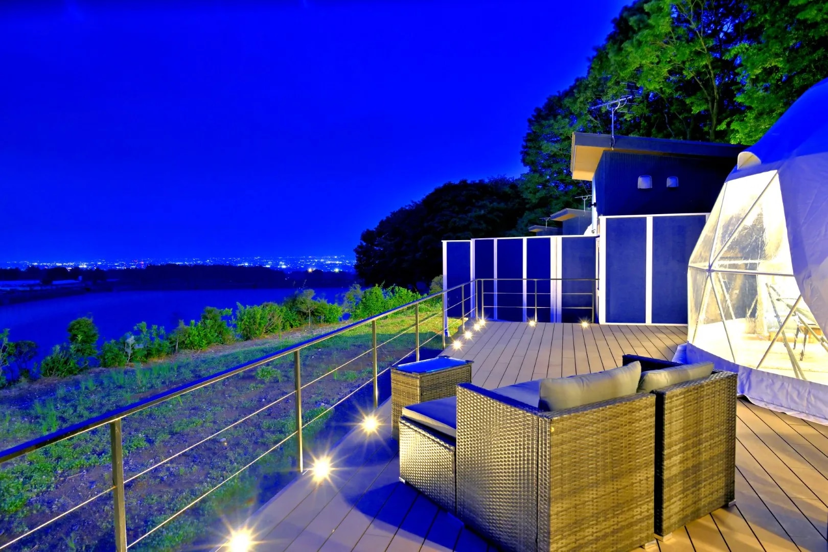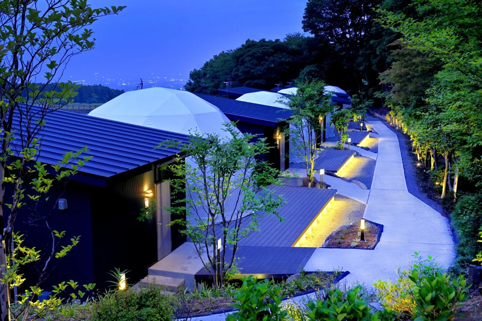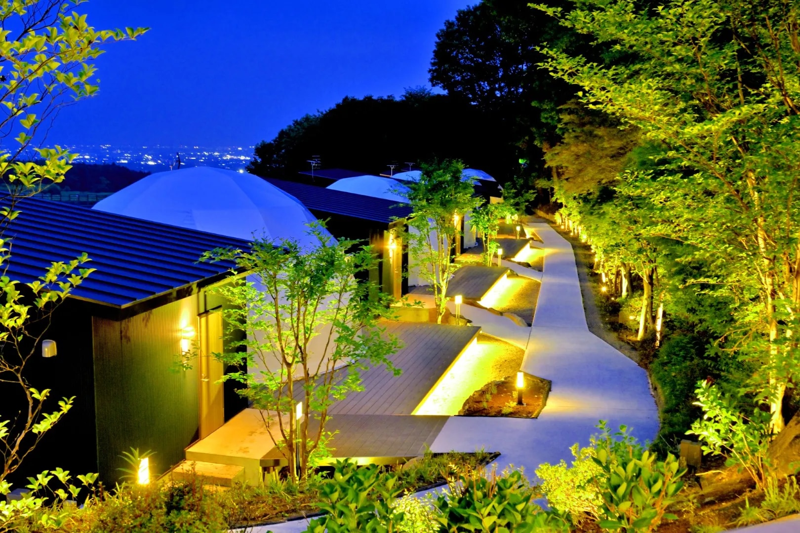 赤城山の南麓に2024年春にグランドオープンした季節・天候問わず快適に過ごせる大人専用のグランピング施設。 自然に囲まれた完全プライベート空間で夜景を眺めながら非日常時間をゆったり満喫できる、全室露天風呂付きのグランピング施設です。 専用ダイニングでのお食事は上州牛やぐんま麦豚、地元野菜を中心としたBBQスタイルでご提供。 到着前にお部屋に用意されているので、専用BBQグリルを使ってお客さまのお好きなタイミングでお食事をお召し上がり頂けます。 赤城の温泉旅館「山屋蒼月」が提供する”GlampingArea 水と風と月”。 日常から遠く離れたこの場所で、水辺のきらめきやそよぐ風、柔らかく照らす月の光を感じつつ眼下に広がる関東平野の夜景を眺めるひと時をお過ごしください。