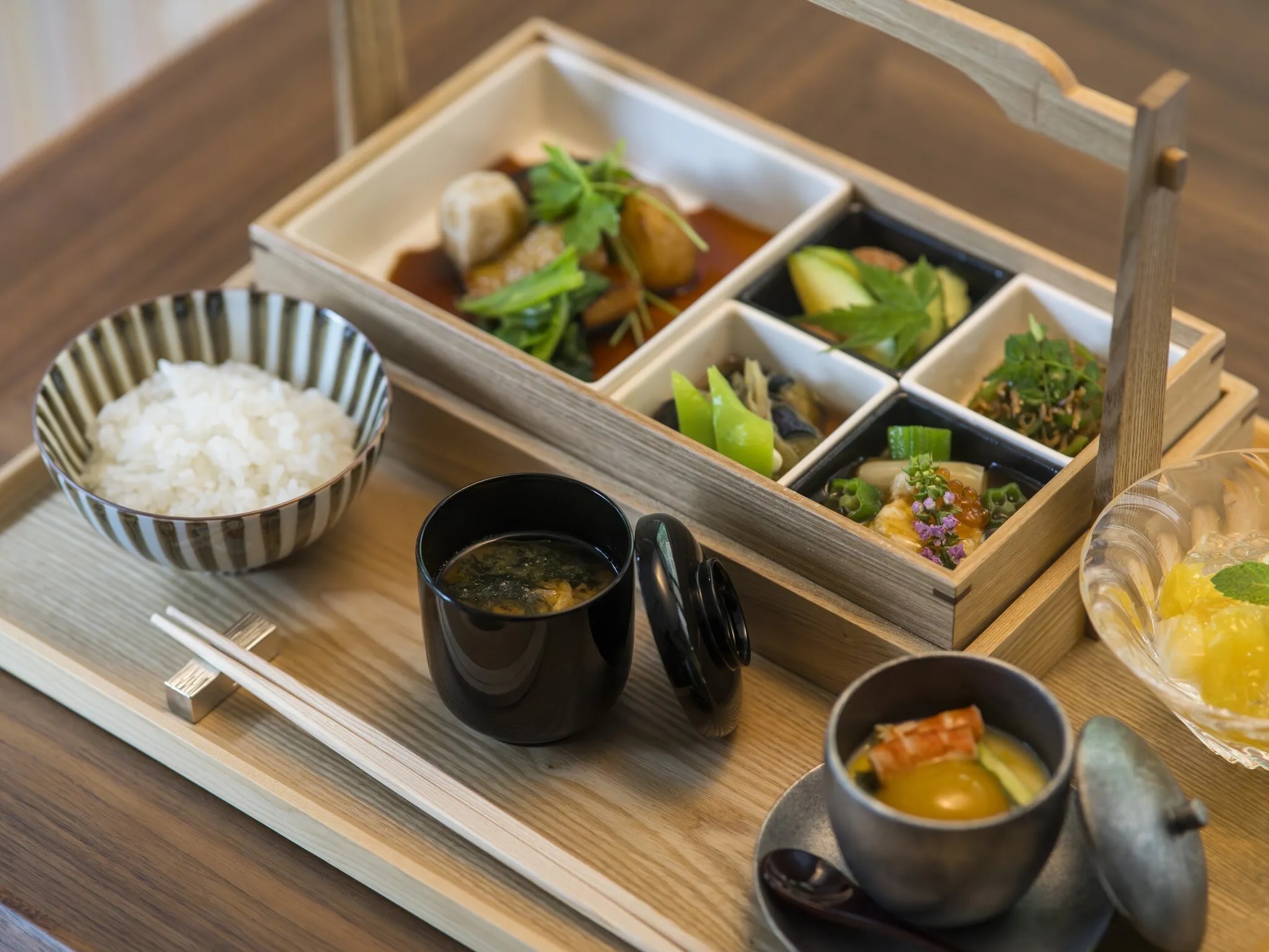 レストラン 48席の特別な割烹料理「りょうぜん」では、極上の食の旅にご案内いたします。料理長の会席コースメニューは、芸術性と持続可能性の両方を讃えた一皿一皿が見どころで、地域の旬の食材を中心に、その産地を物語るようなメニューが提供されます。京野菜や京都の味噌、京都ならではの黒七味など調味料にもこだわり、地元の食材をふんだんに使っています。京都の清らかな軟水に合う昆布を求め辿り着いた5年熟成の利尻昆布からとったコクのある出汁に、鰹節と鮪節を加えたこだわりの出汁は、深いうま味を堪能することができます。