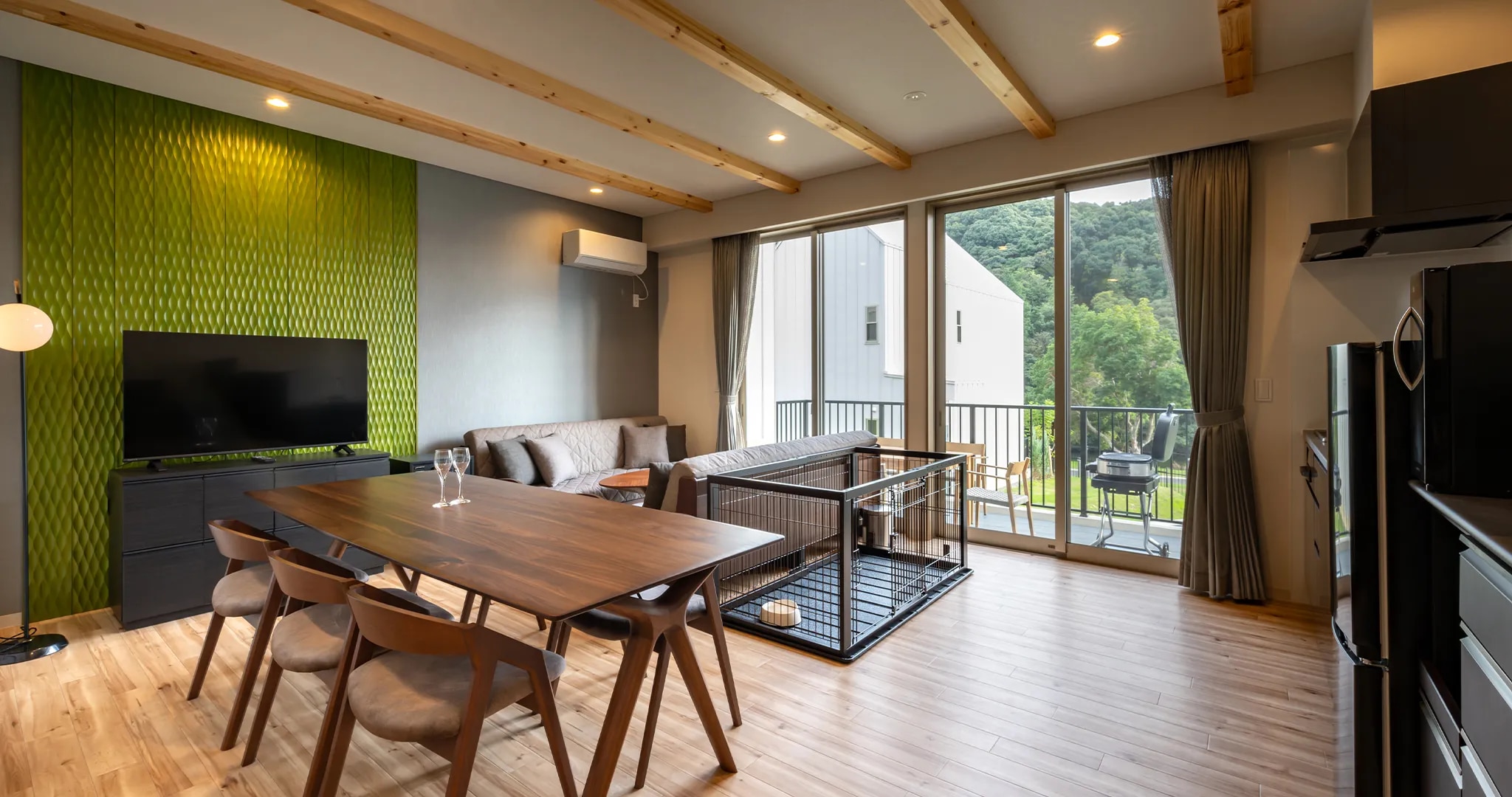 【2024年11月8日開業】 かなたのさとは、関西最大級の広さと開放感を誇る道の駅「四季の郷公園」の奥に静かに佇んでいます プライベートサウナの付いた2階建ての一棟貸しのヴィラ20棟。うち10棟は愛犬も一緒にご宿泊いただけます。 1Fテラスで風を感じながらお愉しみいただくBBQは、地域の食材をふんだんに使用し五感をくすぐり食欲をそそらせます。 喧騒から離れた "かなたのさと" で、ご家族やご友人との忘れられない想い出創りに贅沢な時間をご堪能下さい。
